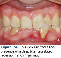 There is a strong correlation between misaligned teeth and gingival recession.16,17 Recession on misaligned teeth is usually associated with teeth that are tilted to the buccal or lingual (buccal or lingual version). The mechanism for this recession is unknown but may be caused by misalignment of teeth stretching the gingival tissue, making it more susceptible to trauma. The only treatment available for teeth with this type of misalignment is orthodontic therapy. Selective grinding of the teeth (occlusal adjustment) or occlusal guard therapy are unlikely to benefit these patients. Interceptive or preventive orthodontic therapy for patients with this type of misalignment may prevent the need for future soft tissue grafting or even the loss of these teeth (Figures 7-8).