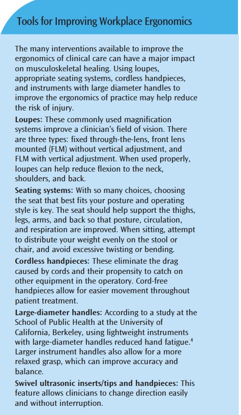 - Lalumandier JA, McPhee SD, Parrott CB, Vendemia M. Musculoskeletal pain: prevalence, prevention, and differences among dental office personnel. Gen Dent. 2001;49:160-166.