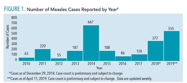 Today, however, this preventable disease is on the rise again. As of April 11, 2019, 555 new cases of measles have been reported (Figure 1).4 States with active cases are California, Colorado, Connecticut, Georgia, Illinois, New Jersey, New York, Oregon, Texas, and Washington. Outbreaks have been linked with travel to areas where the disease is still endemic such as Europe, Asia/Pacific, and Africa.5,6 Other reasons for the increase include vaccination hesitancy and vaccine refusal.
