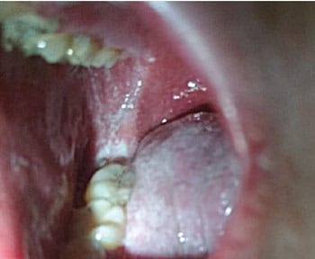 Clinical measles begins with small Koplik’s spots on the buccal mucosa, considered to be pathognomonic for the disease (Figure 2). The lesions can be numerous small, blue-white macules, also referred to as “grains of salt,” surrounded by erythema.9,10 Koplik’s spots occur 1 day to 2 days prior to the characteristic maculopapular skin rash; they may occur on the labial mucosa and soft palate in addition to the buccal mucosa, and in some cases, do not occur at all.10,11 Other oral manifestations associated with measles include candidiasis, necrotizing ulcerative gingivitis, and necrotizing stomatitis if the individual is suffering from severe malnutrition. Pitted enamel hypoplasia of developing permanent teeth may occur in severe cases of measles in early childhood. Enlargement of lingual and pharyngeal tonsils may be found during the course of illness.10