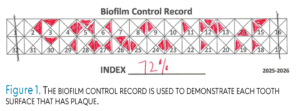 A modified quantitative graph can be used to color in the individual tooth surfaces that have plaque (Figure 1). The percentage of biofilm-free surfaces is ascertained and that information is shared with the patient. Developed by Sigurd Ramfjord, PhD, and Timothy J. O’Leary, DDS, in 1972, the biofilm control record is simple enough to use in large populations for public health education or individual patients at their recare appointments.