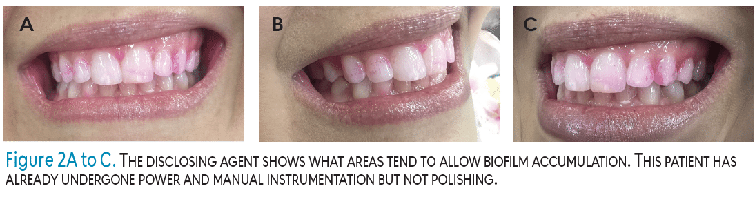 Applying a disclosing agent mid-appointment or post-prophylaxis provides the clinician with either confidence that the appointment is progressing appropriately or alerts the clinician to areas that need more attention. Figure 2A to C features a patient with disclosing solution after ultrasonic and manual instrumentation had been performed but before polishing. This provides the clinician with a guideline on what areas to emphasize. Patients should also be educated on those areas that tend to invite biofilm accumulation.