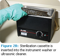 The cassette is used at chairside for organization during patient care. During clean up, waste and sharps are properly disposed of, and the cassette is then transported to the sterilization area in a solid leak-proof container.1 The entire cassette is placed into the ultrasonic bath or instrument washer for initial cleaning. After cleaning, the cassette is thoroughly rinsed and dried, then unit-dosed dry supplies needed during the dental hygiene appointment (gauze, cotton rolls, or cotton tipped applicators) are added, along with an internal chemical indicator.1 Once complete, the cassette is packaged for sterilization.