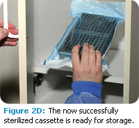 Packaging materials must be compatible with the sterilizer and are considered FDA medical devices.1,4 They must allow penetration of the sterilizing agent (steam or chemical vapor) and keep instruments sterile for up to 6 months.1,4 Perforated cassettes must be packaged in order to keep the contents sterile during storage; otherwise they could be contaminated by air, dust, and other contaminants.1,7 Packaging materials can include self-sealing pouches (Figure 4) or wrapping (see sidebar). Sterilizers can only accommodate a certain number of cassettes because overloading impedes the sterilization process.9 Cassettes should be loaded sideways in the sterilizer to allow for maximum penetration of sterilizing agents.7