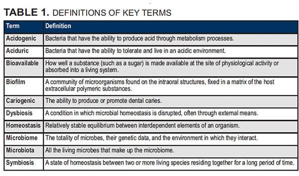 Dental diseases develop via multifactorial processes. Although some dental diseases are the result of genetic factors (eg, amelogenesis imperfecta), others, such as caries, are caused by local environmental factors. This article will focus on local environmental factors as a determinant of health or disease, specifically, how the oral environment plays a significant role in maintaining homeostasis that supports oral health. For example, dental caries develop through a continuum of demineralization and remineralization of the oral hard tissues (enamel and dentin) due to plaque biofilms and their metabolism byproducts.1–3 If demineralization (net mineral loss) is not interrupted by some means, an active caries lesion will eventually form. This demineralization/remineralization continuum is highly exacerbated during an acid attack when salivary pH falls to the critical level of pH 5.5 and below.1,4–6 These acidic episodes are highly dependent on the consumption of fermentable carbohydrates (such as sucrose, glucose, fructose, and cooked starch),1 amount and frequency of consumption, effectiveness of mechanical biofilm removal, distribution of bioavailable remineralizing ions (key definitions are found in Table 1), and the rate and volume at which saliva is excreted.
