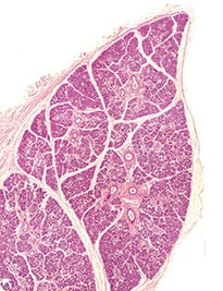 Three pairs of major salivary glands (parotid, submandibular (Figure 1), and sublingual) and up to 1,000 minor salivary glands, located in the labial, buccal, palatal, lingual and retromolar oral mucosa, make up the total daily salivary volume of about 0.6 L.1,2 While most of the saliva is produced by the major glands (90%), the importance of the minor glands, which are nameless except for the von Ebner’s located in the circumvallate papillae of the tongue, should not be overlooked. The minor glands provide a relatively large portion of the salivary mucins needed for lubrication.2 Salivary output varies during the day in response to food intake and circadian rhythm, with peak flow in the late afternoon and lowest secretion during the night (as low as 5% of daytime secretion).1,3 Contributions of each of the major salivary glands during mastication (stimulated saliva) and rest (unstimulated saliva) are different, as well as the composition of their secretions. Watery, low in protein but high in amylase saliva, mostly produced by the parotid glands, is necessary during mastication, food bolus formation, early digestion, and swallowing. In contrast, protein- and mucin-rich unstimulated saliva, secreted continuously at about 0.3 ml to 0.4 ml per minute, is mostly produced by the submandibular glands and serves as a lubricant. Continuous unstimulated flow prevents retrograde infection of the salivary glands by the oral bacteria.1