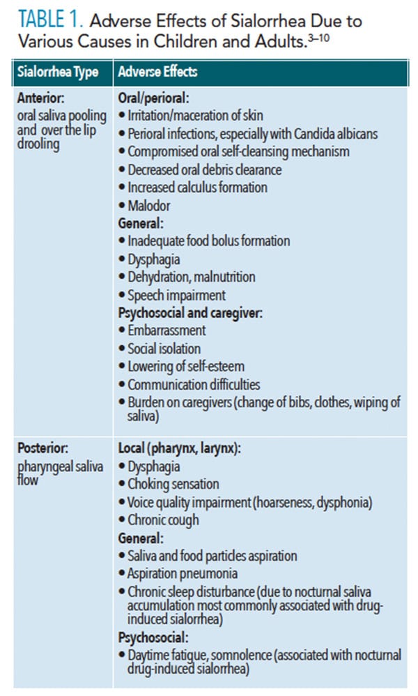 Contributing factors to sialorrhea include anatomical/orthodontic considerations (anterior open bite, malocclusion, macroglossia); insufficient lip closure; difficulty controlling the lips, tongue, and mandible; decreased intraoral sensitivity; and inadequate head/body posture.4,5,10 Regardless of the cause, sialorrhea presents a number of adverse symptoms, including oral/perioral, local, general, psycho-social, and emotional outcomes, as well as substantial burden on caregivers (Table 1). Due to its complexity, it also presents a management challenge requiring a multidisciplinary approach to improve patients’ symptoms and their quality of life.4,9