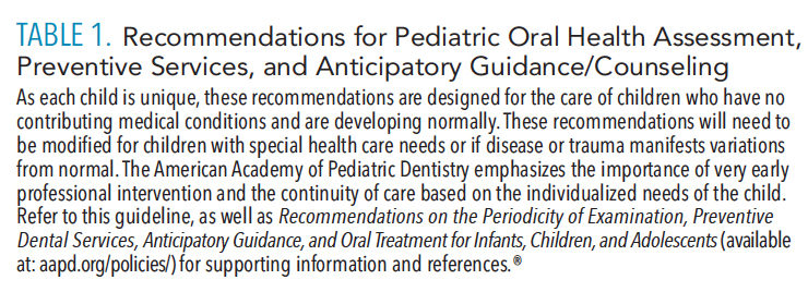The AAPD has developed a chart, Recommendations for Pediatric Oral Health Assessment, Preventive Services, and Anticipatory Guidance/Counseling (Table 1). This helpful resource was created to assist oral health professionals with anticipatory guidance. The chart is organized by age groups so the most relevant and age-appropriate points can be discussed at each visit.