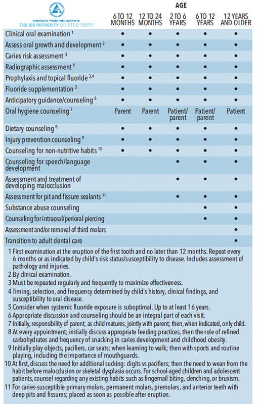 The AAPD has developed a chart, Recommendations for Pediatric Oral Health Assessment, Preventive Services, and Anticipatory Guidance/Counseling (Table 1). This helpful resource was created to assist oral health professionals with anticipatory guidance. The chart is organized by age groups so the most relevant and age-appropriate points can be discussed at each visit. Recommendations for Pediatric Oral Health Assessment