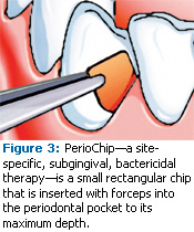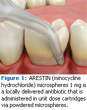 For the treatment of periodontitis, the inoffice, site-specific locally administered anti-microbial/ antibiotics currently on the market are ARESTIN, ATRIDOX, and PerioChip (see Table 1). The reason that mouth rinses are not as effective as site-specific, locally administered antimicrobials is because the use of a rinse subgingivally through irrigation or power instru mentation in patients with moderate periodontitis does not provide the substantivity needed to make a significant change in the bacteria. Substantivity is the capacity of an oral antimicrobial agent to continue its therapeutic activity for a prolonged period of time. Nor is the concentration of the antimicrobial enough to kill or suppress the bacteria for the appropriate length of time. This is called the minimal inhibitory concentration (MIC) and it represents the concentration of antibiotic required to inhibit growth of a planktonic bacterial population. Site-specific, locally administered agents have a higher and a longer substantivity and they maintain a MIC for enough time to make a positive effect in the pocket. For example, ARESTIN has been shown to have a high MIC for 14 days to 21 days.11 The antimicrobial is placed in the pocket, it releases the drug for a certain length of time, and it kills or suppresses bacteria that are not eradicated through scaling and root planing. If dental hygienists are treating patients with periodontitis, locally administered antimicrobials are much more effective than mouthrinses subgingivally. While locally administered antimicrobials are not 100% effective, they can work quite well in some patients and sites.