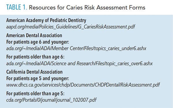 Today, caries risk assessment forms are easily accessed via the American Academy of Pediatric Dentistry (AAPD), American Dental Association (ADA), and California Dental Association (Table 1). These tools provide a standardized format for assessing and documenting caries risk. Divided by age, each patient’s risk factors are noted on the form. The results are tallied, and the patient is categorized as low, moderate, or high risk. Prevention and treatment plans are implemented based on designated risk. As a result of CAMBRA’s impact, in 2014 the ADA added three distinct Current Dental Terminology diagnostic codes—D0601, D0602 and D0603, representing low, moderate, and high risk—for caries risk assessment reporting.