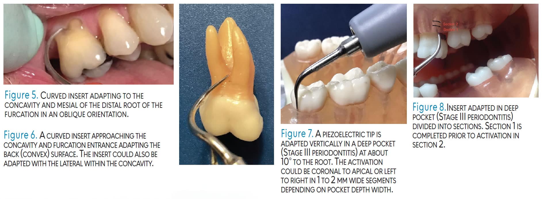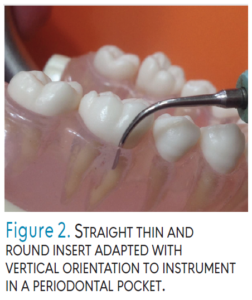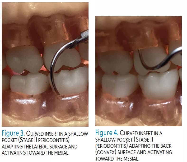Periodontal pocket depth is 5 mm or less and generally will be wide, although localized areas of narrow depth could occur. In these cases, vertical and oblique orientations with fine thin tips are used to negotiate the pocket configurations (Figure 3 and 4). Table 1 reviews adaptation and activation principles.