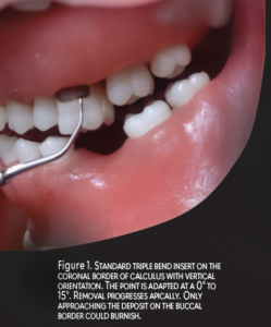 Adapting the UIT with a vertical orientation (ie, parallel to the long axis and directed toward the pocket base or coronal border of calculus) is used to fracture tenacious, heavy calculus and to reach the base of narrow periodontal pockets (Figure 1 and Figure 2). Tips used for this orientation should be the standard beveled or universal designs for tenacious calculus and thin UITs for narrow pocket depth. Horizontal orientation, which is perpendicular to the tooth, is used most often on proximal surfaces with curved UITs. Oblique orientation positions the UIT on the lateral surface; curved UITs may be used. Implement right and left UITs by either adapting the end that curves toward the mesial surface, adapting the lateral surface of a UIT (Figure 3) or apply the convex back of a magnetostrictive insert tip on the buccal, lingual, and proximal surfaces (Figure 4).
