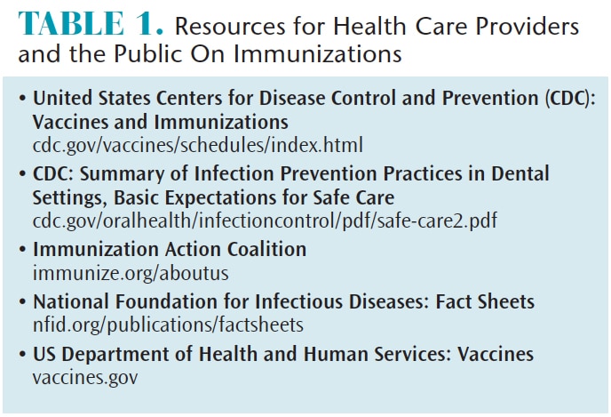 As the infection prevention coordinator, the dental hygienist should be knowledgeable on the most current vaccination protocols as outlined by the CDC, including policies and documentation of vaccinations. Table 1 lists helpful resources for health care professionals and the public regarding immunization recommendations.