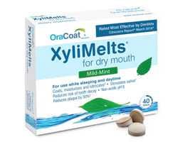 OraCoat® XyliMelts® for dry mouth is an oral adhering disc that sticks to the gums, releasing one-half gram of xylitol, to stimulate saliva and reduce plaque and new cavities, as well as cellulose gum that turns a small amount of saliva into a gel that coats and lubricates the mouth.