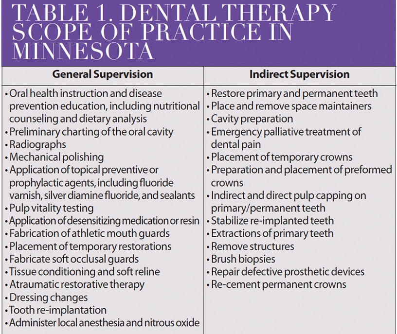 Table 1 lists the services I can provide. For the licensed dental therapist, there are two levels of supervision. General supervision is given for preventive services, similar to a dental hygienist. Indirect supervision is given for more invasive, irreversible procedures. In Minnesota, dental therapists can earn a certificate in advanced dental therapy. Once certified, advanced dental therapists can work under general supervision for all procedures if agreed upon with their supervising dentists. I achieved my advanced dental therapist certification in April 2016.