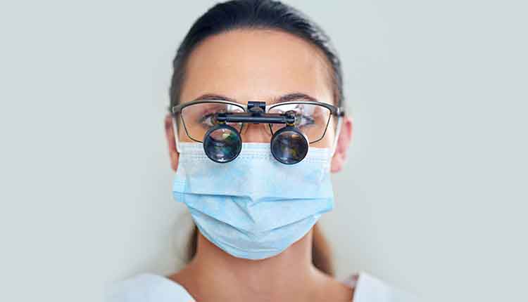 The clinician should maintain the ideal working distance of 12” to 16” between his or her eyes and the patient’s head, while the clinician’s back and neck remain in line with the long axis of the body.