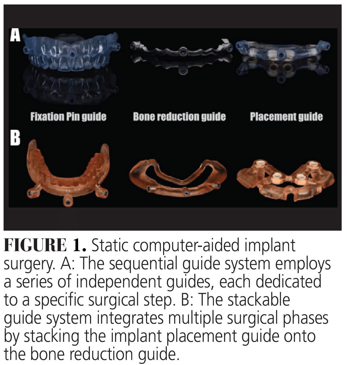 There are three primary approaches for guided surgery: static computer-aided implant surgery (s-CAIS), dynamic computer-aided implant surgery (d-CAIS), and robot-assisted implant placement.3,4 Choosing among these techniques depends on clinical preferences, workflow integration, and case-specific requirements; though s-CAIS is predominantly used in a clinic. Regardless of the selected method, guided and robotic-assisted implant surgeries contribute to improved implant placement accuracy, reduced surgical invasiveness, and enhanced long-term treatment outcomes.5