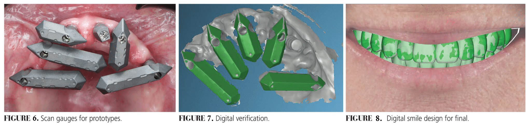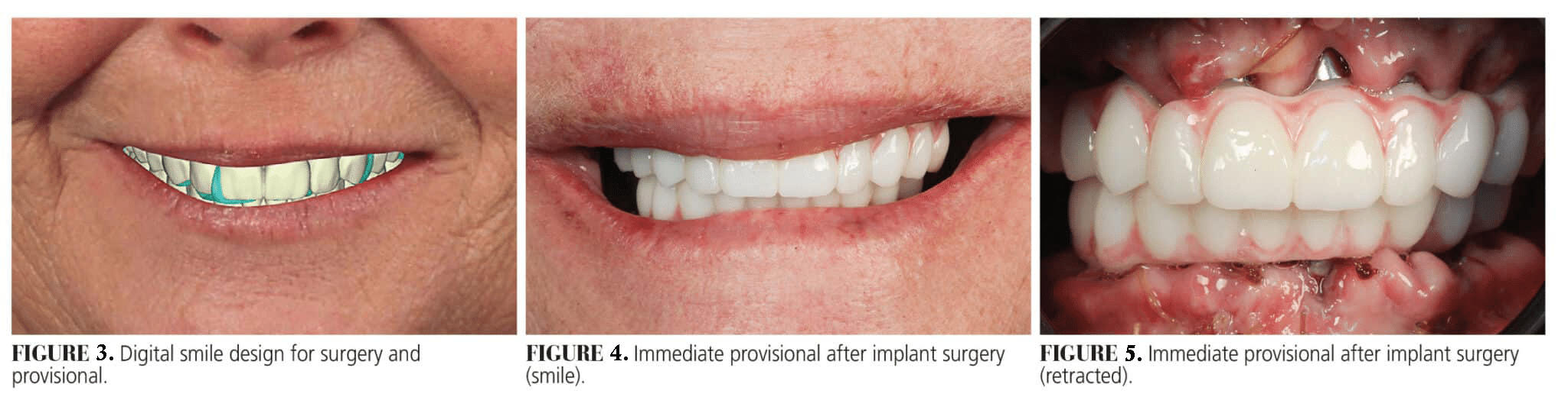 Treatment options of crown and bridge on implants and full-arch implant prostheses were discussed. The patient accepted proceeding with dual-arch full-arch implant prostheses. Utilizing a fully digital workflow, photographs were made and sent for digital smile design (Figure 3). Once the design was approved, a stereolithography file of the digital smile design was merged with an intraoral scan and CBCT imaging to plan for implant surgery. Six maxillary implants and four mandibular implants were placed by an oral and maxillofacial surgeon.