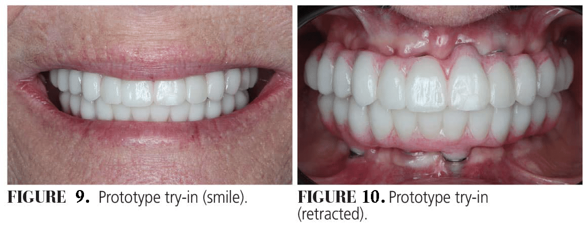 Immediately following the surgery, appropriate multiunit abutments were placed and scan gauges were scanned. These scans were merged with the digital smile design to fabricate immediate provisional hybrid prostheses. Provisionals were printed using a ceramic-hybrid resin and placed the next day following immediate load protocol (Figures 4 and 5). After implant healing for 3 months, provisionals were removed, and scan gauges were placed and scanned to proceed with fabrication of prototypes and zirconia full-arch implant prostheses (Figure 6). Scans were verified chairside (Figure 7). Design changes were made to the provisionals (Figure 8) and prototypes were fabricated for try-in (Figures 9 and 10).