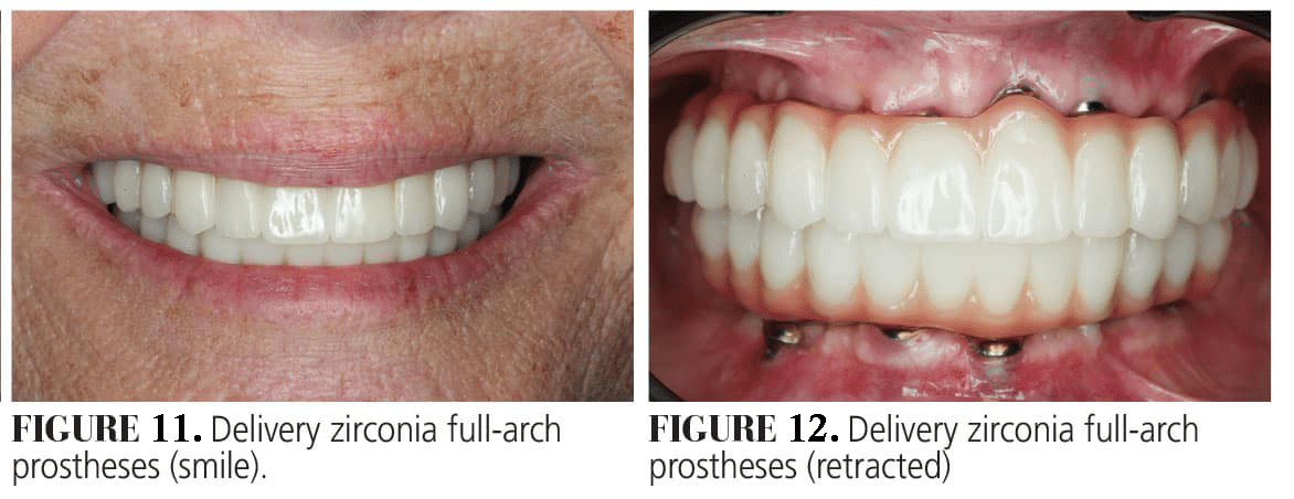 After prototype approval, new scans of the prototypes were made and screw-retained maxillary and mandibular titanium bar with zirconia overlays were fabricated and inserted (Figures 11 and 12). Oral hygiene was reinforced and maintenance protocols established. An occlusal device was fabricated. The patient reported very high satisfaction with the treatment rendered.