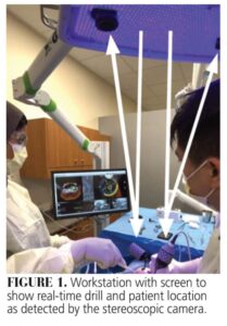Navigation systems for oral and maxillofacial surgery are mainly based on optical tracking technology. The patient will have devices attached to his/her jaw and on the handpiece used during surgery. These devices will have light-emitting diodes or passive reflecting tracking elements that are tracked by the stereoscopic optical camera and guided by the preplanned implant position on the CBCT. The accuracy of these optical tracking systems usually lies between 0.1 and 0.4 mm (Figure 1).11,12