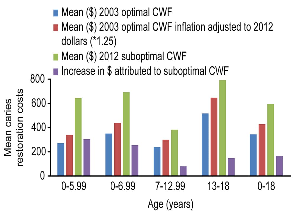 FIGURE 1. Mean caries restoration costs according to age for children with optimal or suboptimal community water fluoridation (CWF). First, the mean cost in 2003 for children with optimal CWF was calculated; the mean cost in 2003 was then adjusted for inflation (*1.25) according to the 2012 dollar value; and lastly the increase cost attributed to suboptimal CWF was calculated. Meyer J, Margaritis V, Mendelsohn A. Consequences of community water fluoridation cessation for Medicaid-eligible children and adolescents in Juneau, Alaska. BMC Oral Health. 2018;18:1–10.
