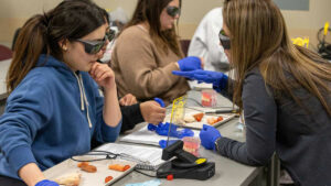 The students, who will graduate in May, tested the intensity of the various types of lasers, using them on foodstuffs of differing textures and thicknesses to simulate what they will encounter when they treat the tissues in their future patients’ mouths. The lasers are useful in treating oral ulcers and other conditions by killing bacteria around the teeth and in the mouth to promote healing.