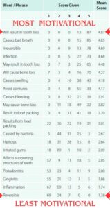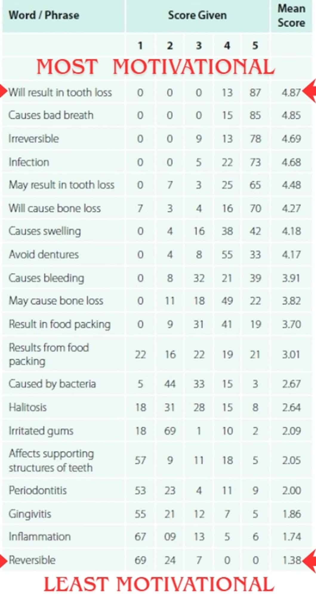 As a periodontist, I wanted to explore whether the specific words I use when discussing periodontal diseases with my patients influence their motivation to improve their oral health. So, I decided to conduct a pilot study of 100 patients in my practice who rated various words and phrases on a scale of 1 to 5 based on how motivating they found them.1
