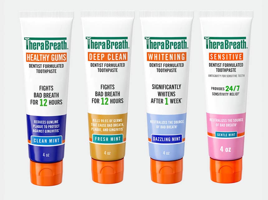 TheraBreath Sensitive joins the brand’s complete toothpaste portfolio, which includes TheraBreath Healthy Gums Toothpaste (formulated to help prevent plaque and gingivitis‡), TheraBreath Deep Clean Toothpaste (kills 99.9% of germs that cause bad breath, plaque, and gingivitis†), and TheraBreath Whitening Toothpaste (peroxide-free formula that removes surface stains with visible whitening after one week of twice-daily brushing).