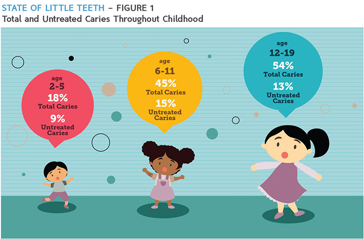 But there’s still work to be done, as data from 2015–2016 shows that caries affects one in five children under the age of 5, about half of children ages 6 to 11, and more than half of those ages 12 to 19. Additionally, 9% of children ages 2 to 5 have untreated caries in primary teeth.