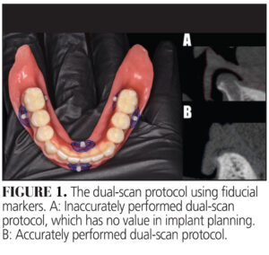 This protocol involves acquiring two CBCT scans: one with the patient wearing the diagnostic denture and another of the denture alone, while incorporating five to six fiducial markers on the denture (with a minimum of three). Two critical considerations in the dual-scan procedure are proper soft tissue adaptation and stable occlusion of the diagnostic denture.2 Inadequate adaptation of the denture base to the soft tissue or an unstable occlusal relationship can result in errors that mislead the planning process (Figure 1). Therefore, ensuring accuracy during the first diagnostic phase is paramount, as it serves as the foundation for the entire workflow.