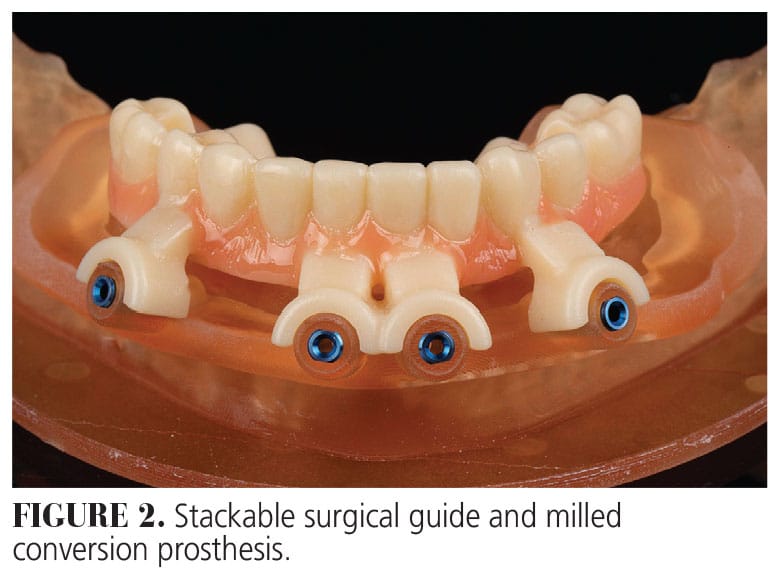 Various technologies and techniques are available for full-arch rehabilitation, including trough guides from ideal denture set-ups (Figure 1), stackable guides with prefabricated conversion prostheses (Figure 2), photogrammetry, and scan gauges.1 Historical challenges in transitioning from the implant healing phase to final prosthesis have been addressed by newer digital methods that allow efficient progression in just a few appointments. These advanced approaches include photogrammetry, scan bodies with reverse scan techniques, and scan gauges, though they require intraoral scanners and specific digital systems. While initial costs and learning curves present barriers to adoption, these techniques become highly predictable once mastered.